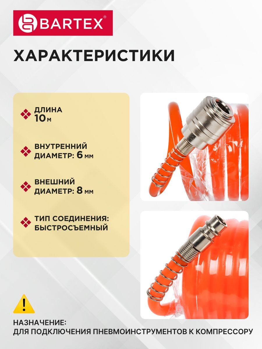 Шланг воздушный Bartex предназначен для подключения пневмоинструментов к компрессору. Длина шланга позволяет осуществлять работы в удаленном от компрессора месте. Спиральное исполнение предотвращает перегибы и увеличивает удобство при использовании и хранении.