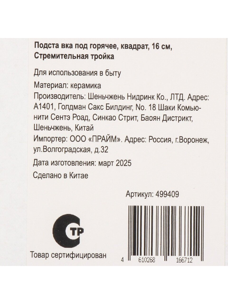 Подставка под горячее, керамика, квадратная, 16 см, Стремительная тройка, Y4-9237 - фото 1 от пользователя