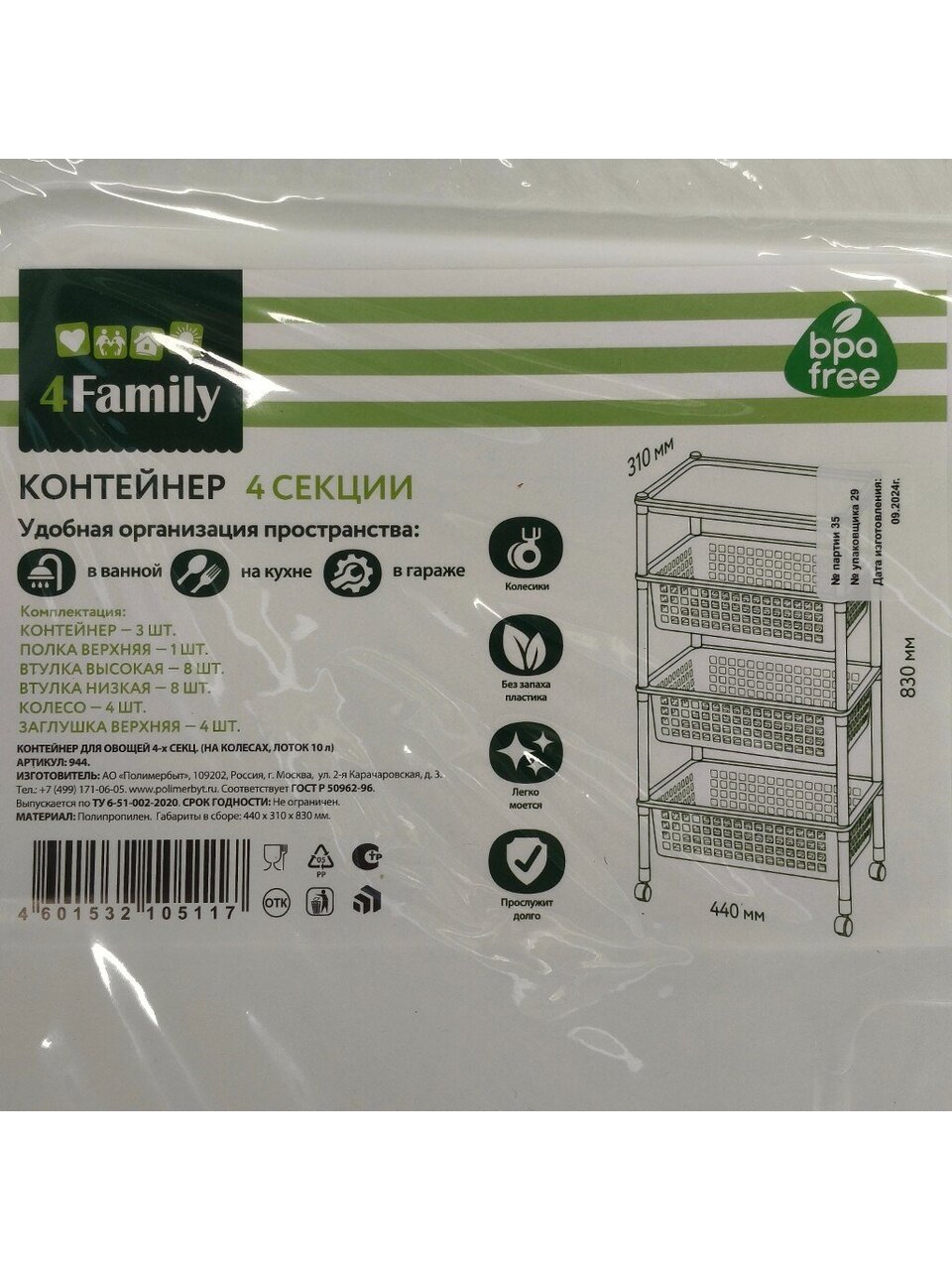 Вы можете приобрести «Полка для овощей, пластик, 4 секции, 44х31х83 см, на колесах, Полимербыт, С944» и другие товары в нашем интернет-магазине в Казани по низким ценам и с бесплатным самовывозом.