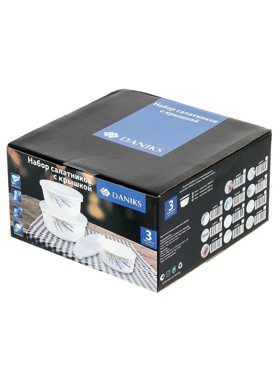 В наборе три круглых салатника: диаметры 14, 16 и 19 см, высота 9 см, объёмы 0.5, 0.8 и 1.4 л. Все миски выполнены из прочной стеклокерамики с рисунком, крышки входят в комплект.