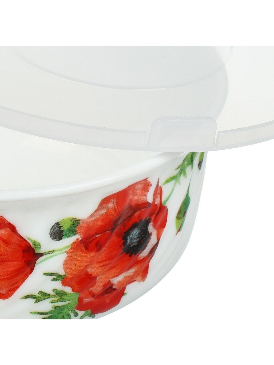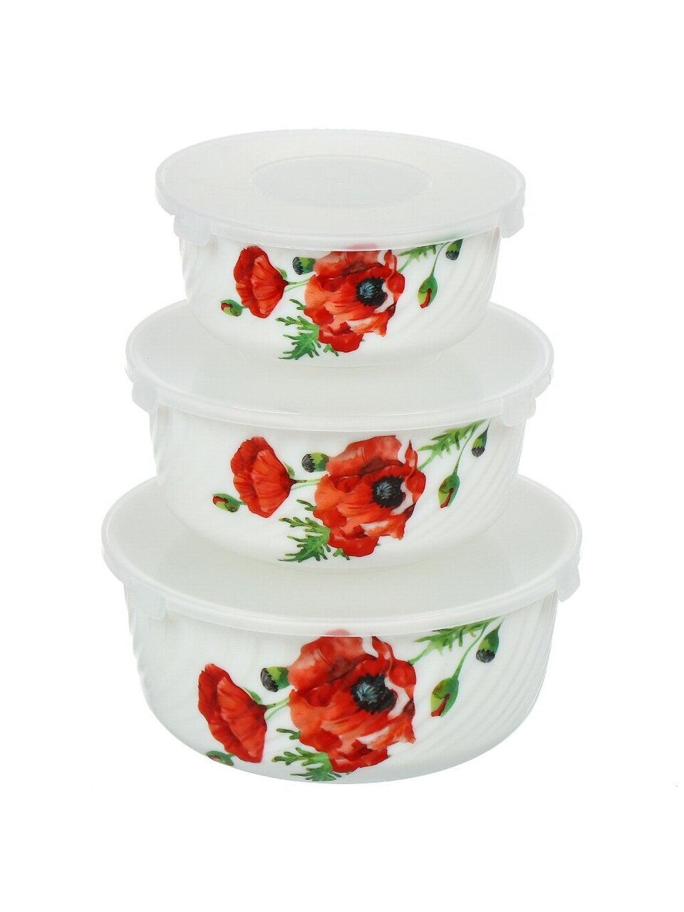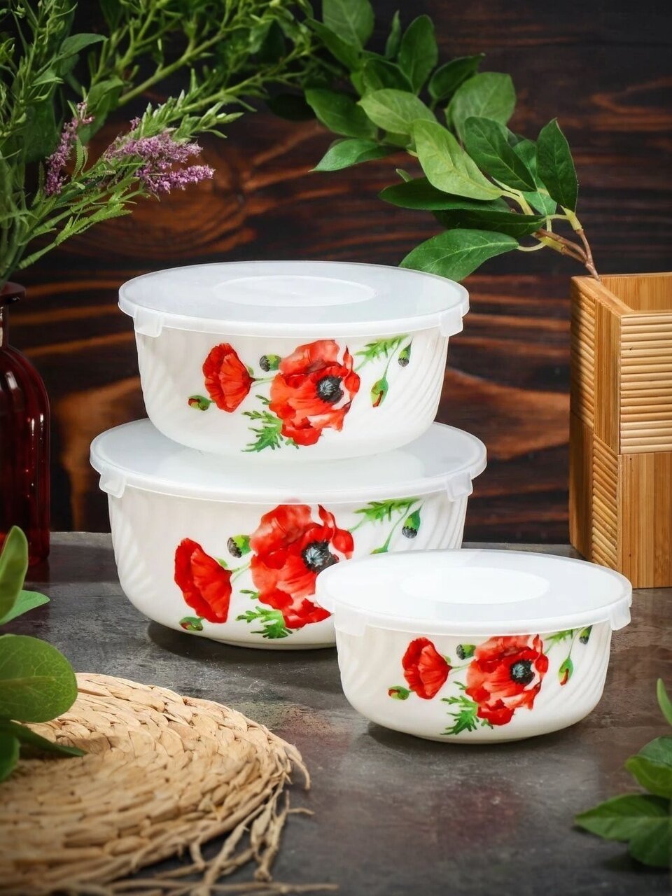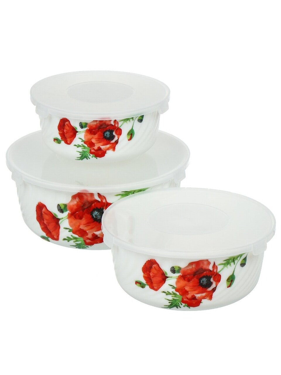 Салатники Daniks Алый мак: 3 стеклокерамических миски с крышками для сервировки и хранения — оптимальный набор для кухни, дачи и подарка.
