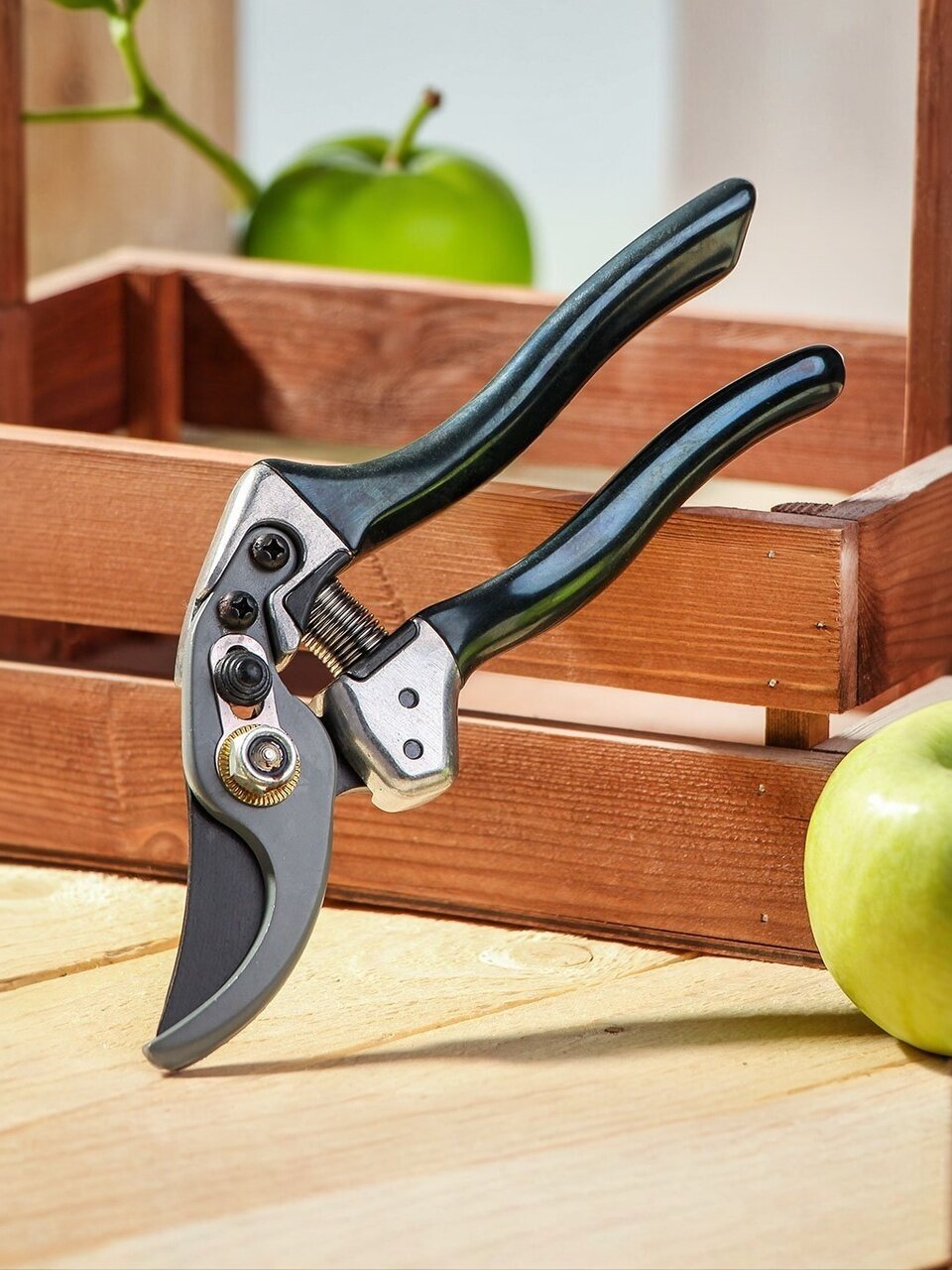- Секатор изготовлен из специальной легированной стали, что позволяет работать им без переточки длительное время и легко справляться с сухими ветками.