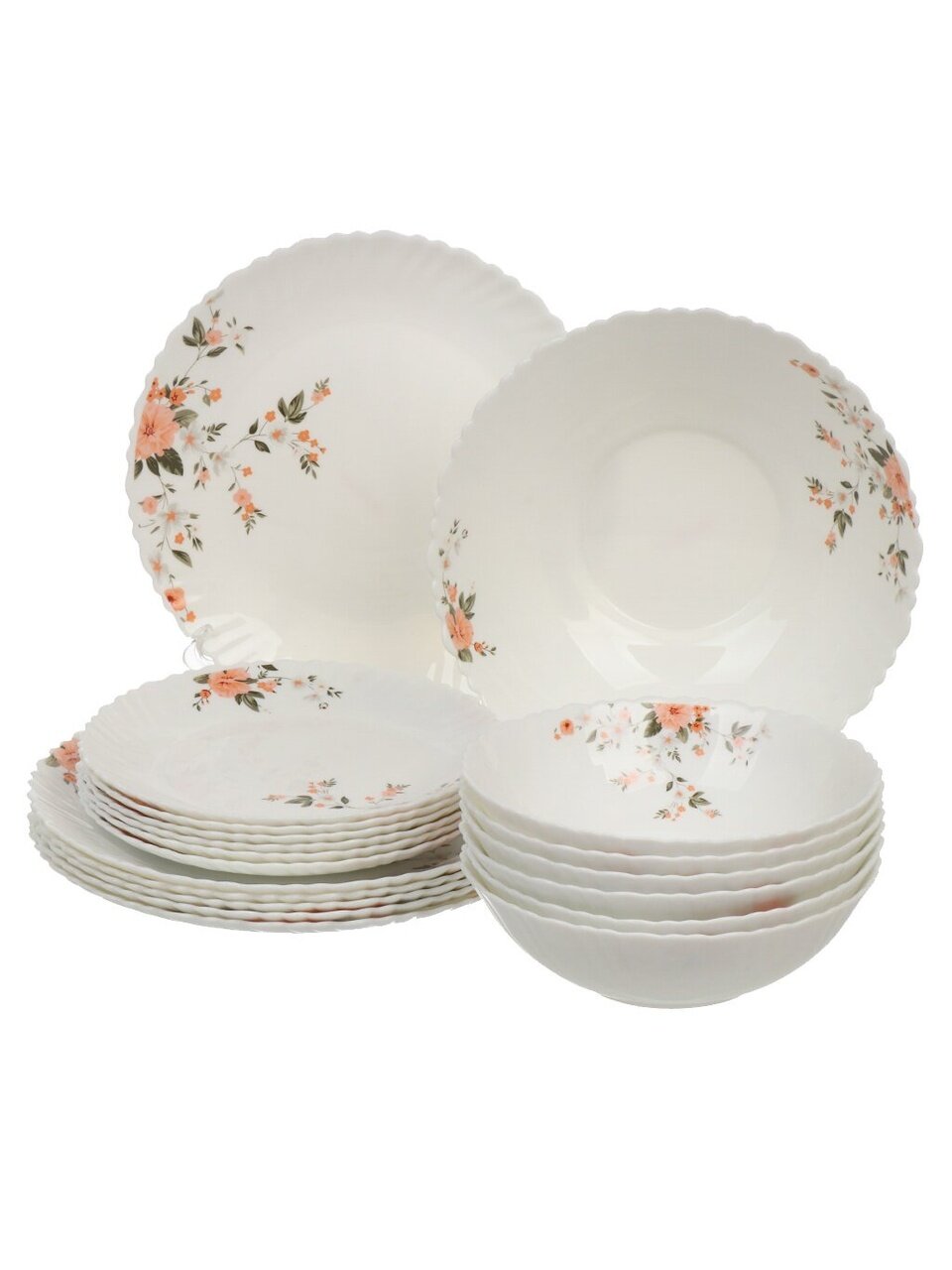 В комплект входит 19 предметов на 6 персон: тарелки, салатники, блюда. Все элементы выполнены из прочной стеклокерамики и рассчитаны на ежедневное использование.