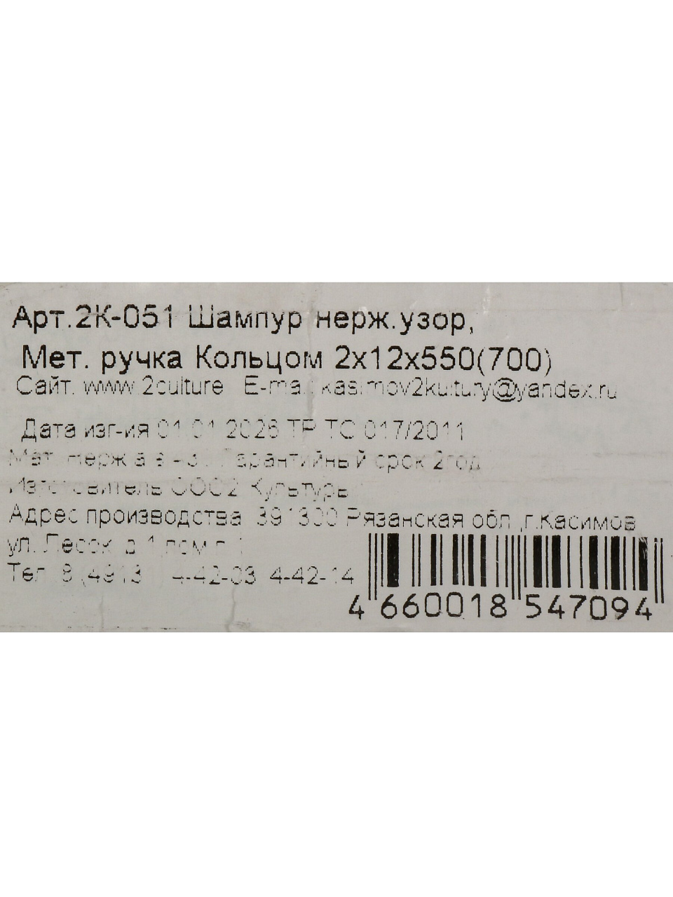 Модель 2К-051 имеет общую длину 700 мм, рабочую часть 550 мм, ширину 12 мм и толщину 2 мм – оптимальные параметры для стандартных мангалов и грилей.