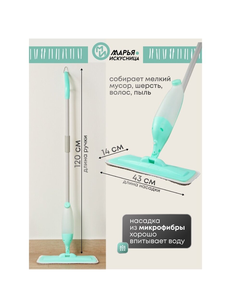 Швабра с распылителем Марья Искусница - это улучшенная конструкция швабры, облегчающая уборку пола, позволяющая одновременно смачивать пол и протирать его насухо, удаляя все загрязнения. На швабре закреплен резервуар для воды или моющего средства, которое легко распыляется с помощью рычага-распылителя, расположенного на ручке швабры. Швабра изготовлена из высококачественного ударопрочного пластика, тканевая насадка - микрофибра, которая хорошо впитывает жидкости, не оставляет разводы и очень долговечна в использовании. Конструкция швабры разборная, в разобранном виде она компактна, занимает мало места, поэтому хранить ее очень удобно.