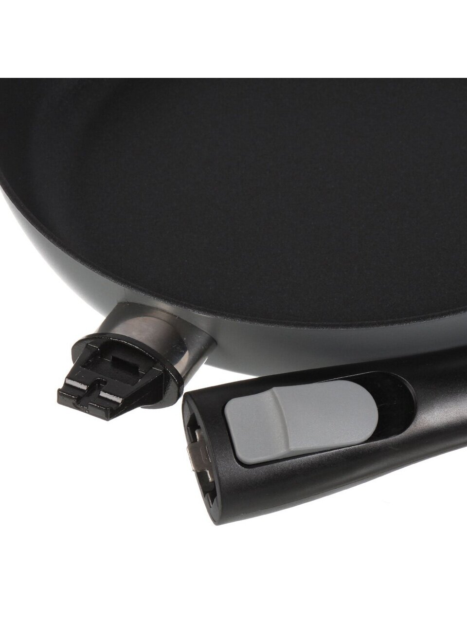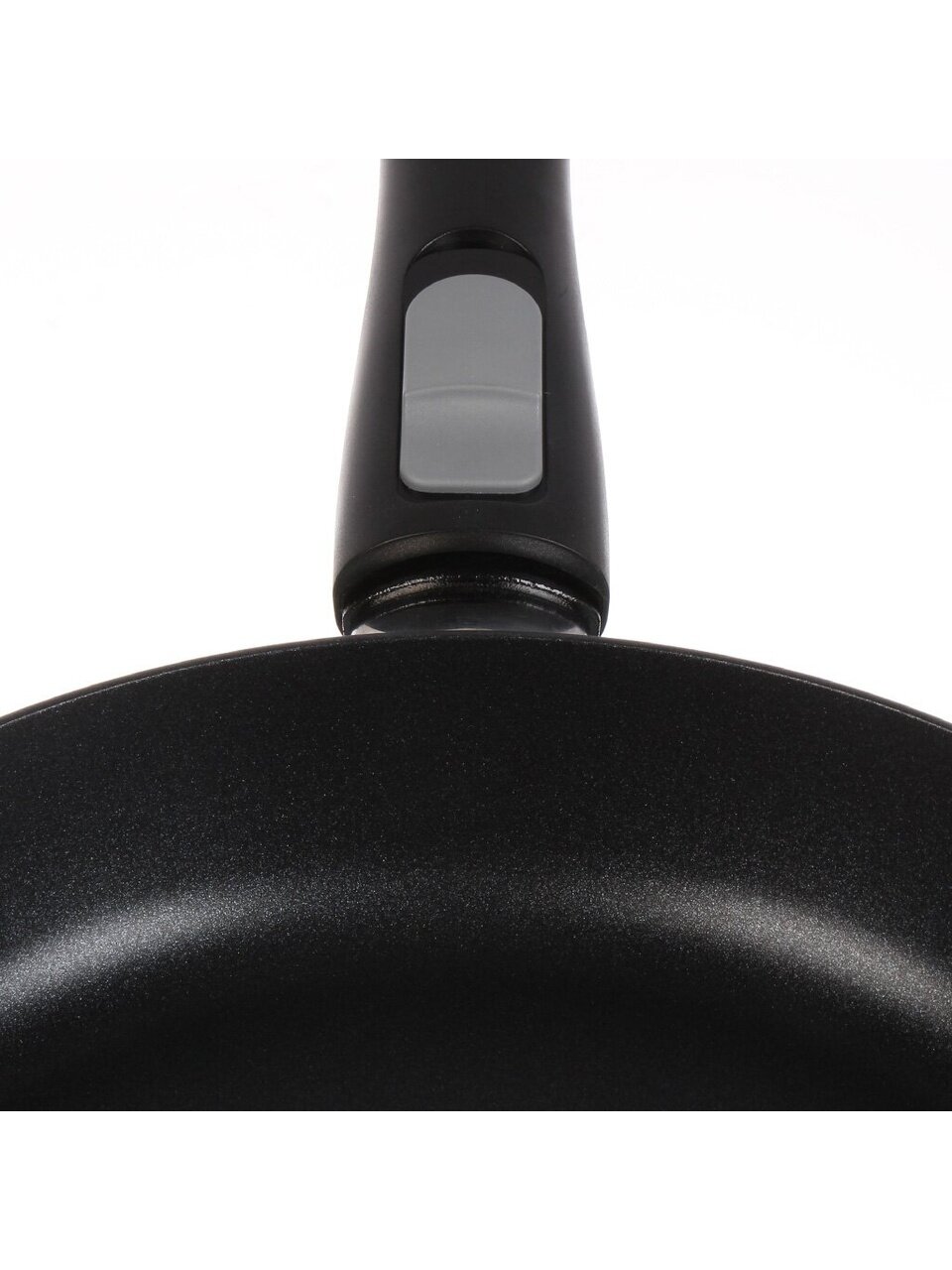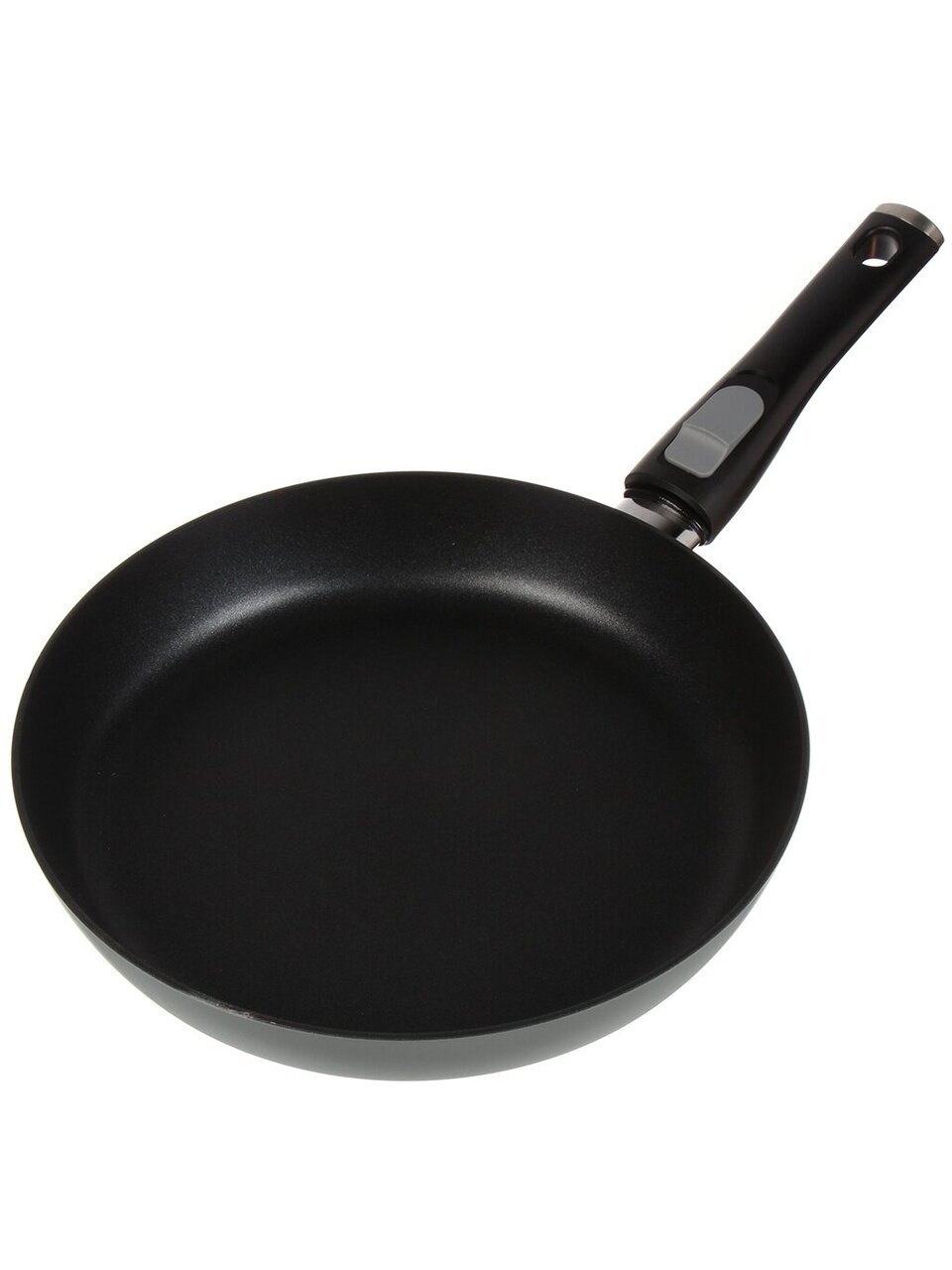 Сковорода из литого алюминия диаметром 28 см с тефлоновым антипригарным покрытием — универсальное решение для приготовления мяса, рыбы, омлета и оладий. Благодаря толстому дну (6 мм) и стенкам (3,8 мм) тепло распределяется равномерно, что предотвращает подгорание и позволяет готовить на минимальном количестве масла. Съемная ручка облегчает мытье и экономит место на кухне — это особенно важно для небольших пространств или дачных условий.
