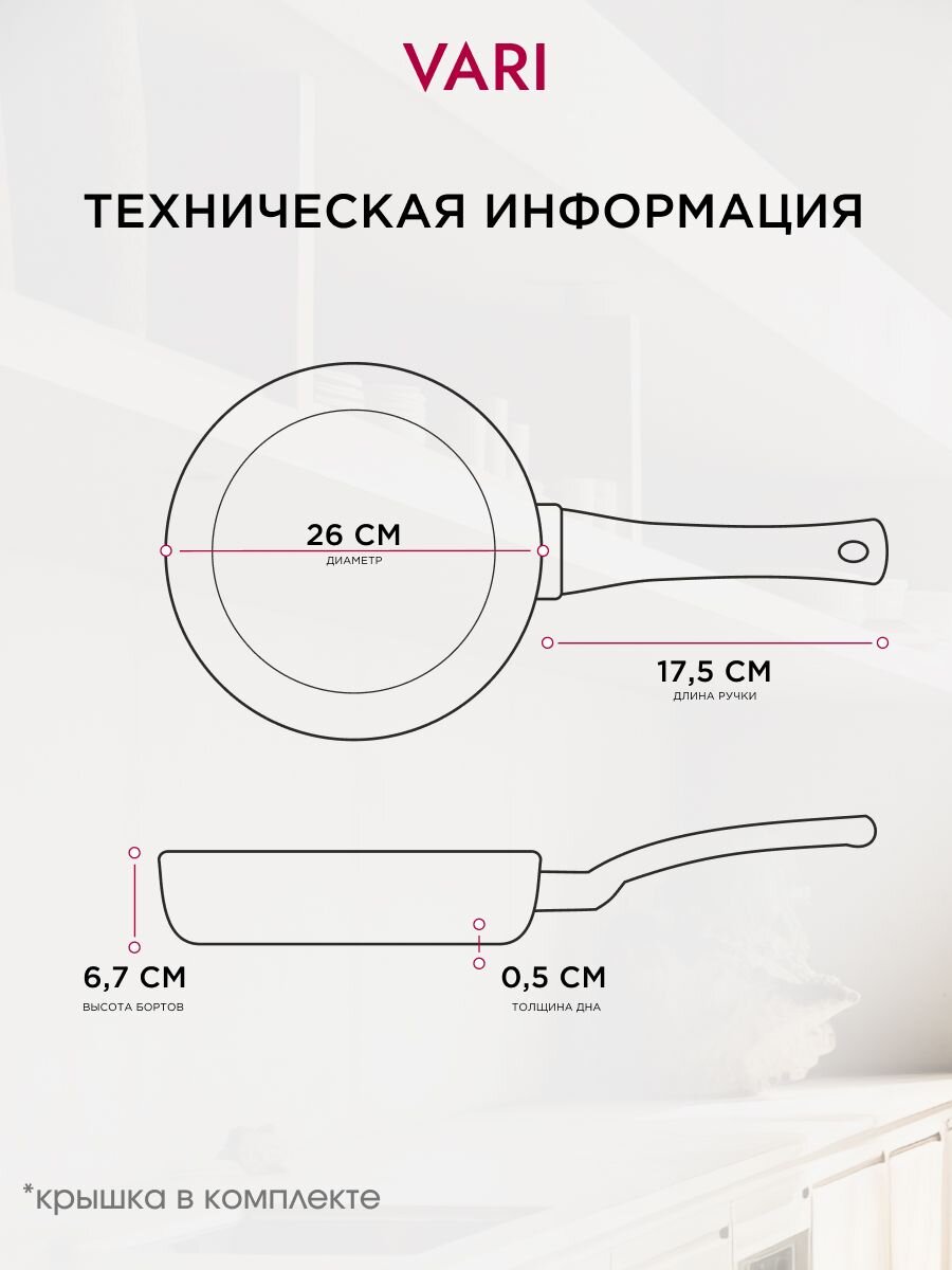 Сковорода алюминиевая Vari 26 см с антипригарным покрытием и крышкой — оптимальный выбор для дома и дачи: готовьте мясо, рыбу или омлет быстро и без пригорания.