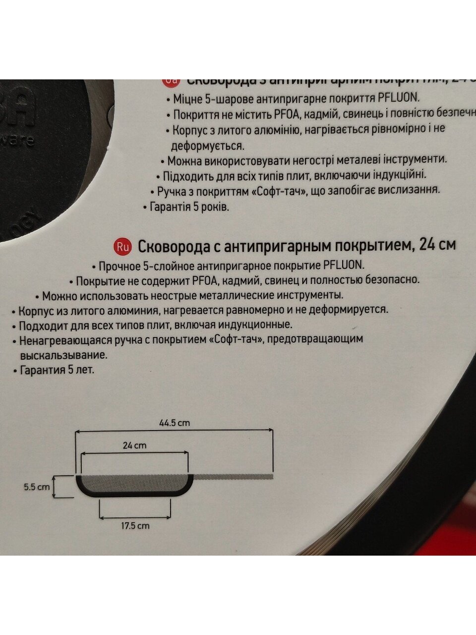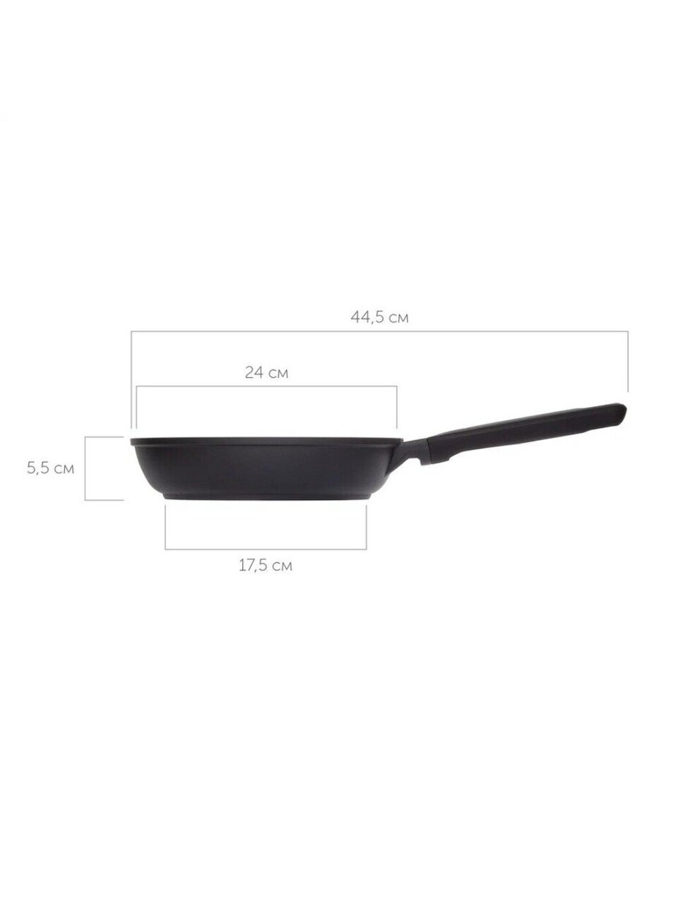 Диаметр сковороды — 24 см, диаметр дна — 17,5 см, высота борта — 5,5 см. Эти параметры делают её универсальной для жарки и тушения.