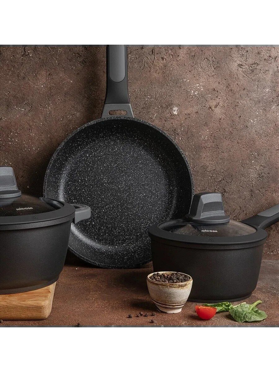 Сковорода Nadoba Dara 24 см — идеальный выбор для тех, кто ищет, какую сковороду купить для индукционной плиты или как выбрать универсальную посуду для кухни. Благодаря литому алюминию и антипригарному покрытию нового поколения вы можете жарить мясо, рыбу, овощи, готовить омлет, оладьи и яичницу без риска пригорания. Толстое дно обеспечивает равномерное распределение тепла, а оптимальная высота борта делает сковороду удобной для тушения.
