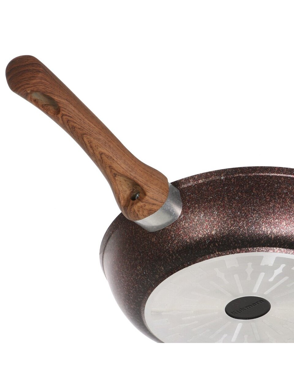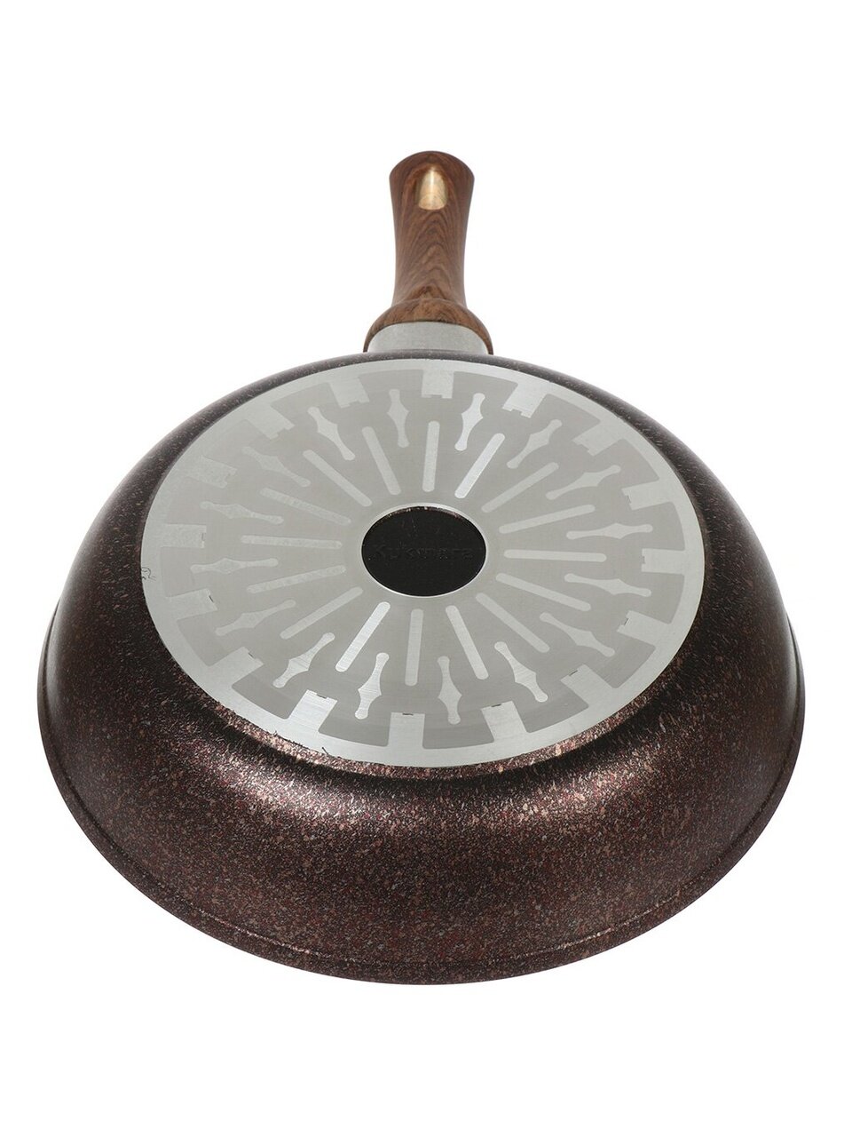 В отличие от обычных алюминиевых или тонкостенных сковород, Kukmara Granit Ultra Red Induction имеет усиленное дно (6 мм) и стенки (4,5 мм), что обеспечивает равномерное распределение тепла и устойчивость к деформации. Часто спрашивают, чем отличается гранитное покрытие — оно прочнее классических антипригарных слоёв, устойчиво к царапинам и служит дольше. Модель не комплектуется крышкой и не имеет съёмной ручки, что делает её цельной и надёжной при интенсивном использовании. Идеально подходит для приготовления мяса, курицы, рыбы — как на домашней кухне, так и на даче.