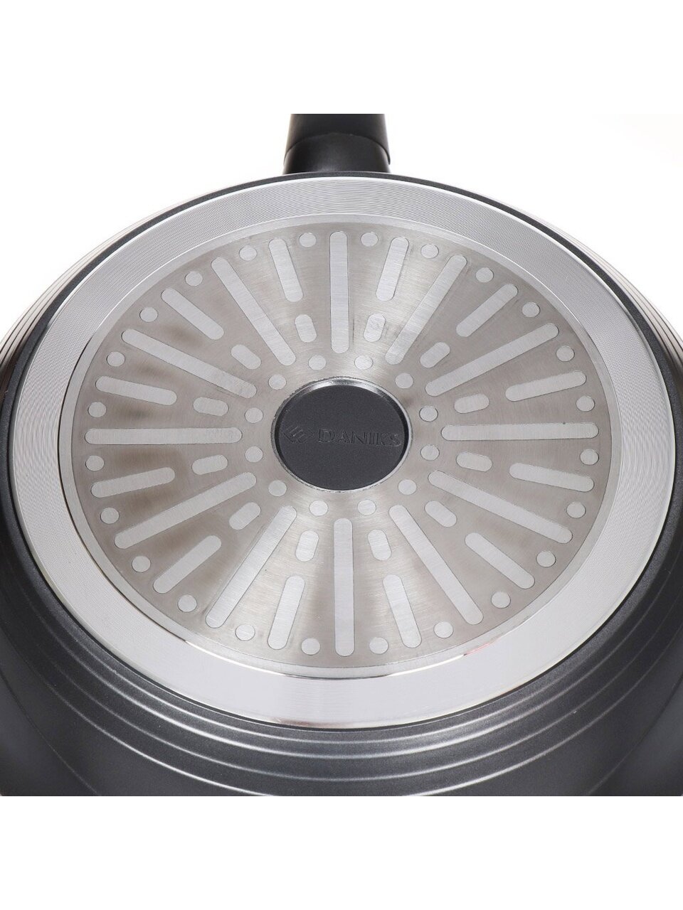 В отличие от классических тонкостенных сковород, Daniks Shoven оснащена толстым дном (5 мм) и высокими бортами (55 мм), что позволяет использовать её для жарки, тушения, приготовления мяса, рыбы, курицы. Крышка в комплекте сохраняет сочность блюд, а возможность мытья в посудомоечной машине экономит ваше время. Для покупателей, сравнивающих, что лучше для дачи или дома — литой алюминий или сталь — эта сковорода выигрывает по весу (1,35 кг) и скорости нагрева, при этом подходит для всех типов плит.