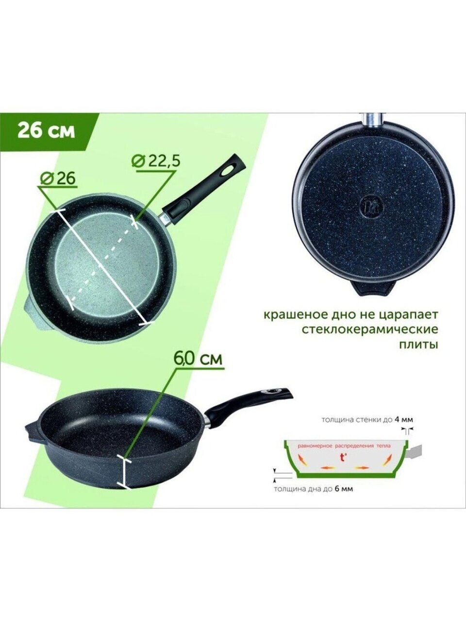 Оцените удобство: съемная ручка экономит место, а диаметр 26 см — идеален для семьи или компании. Закажите сковороду Мечта Гранит black — выгодные условия покупки, гарантия 12 месяцев и проверенное качество от российского производителя.