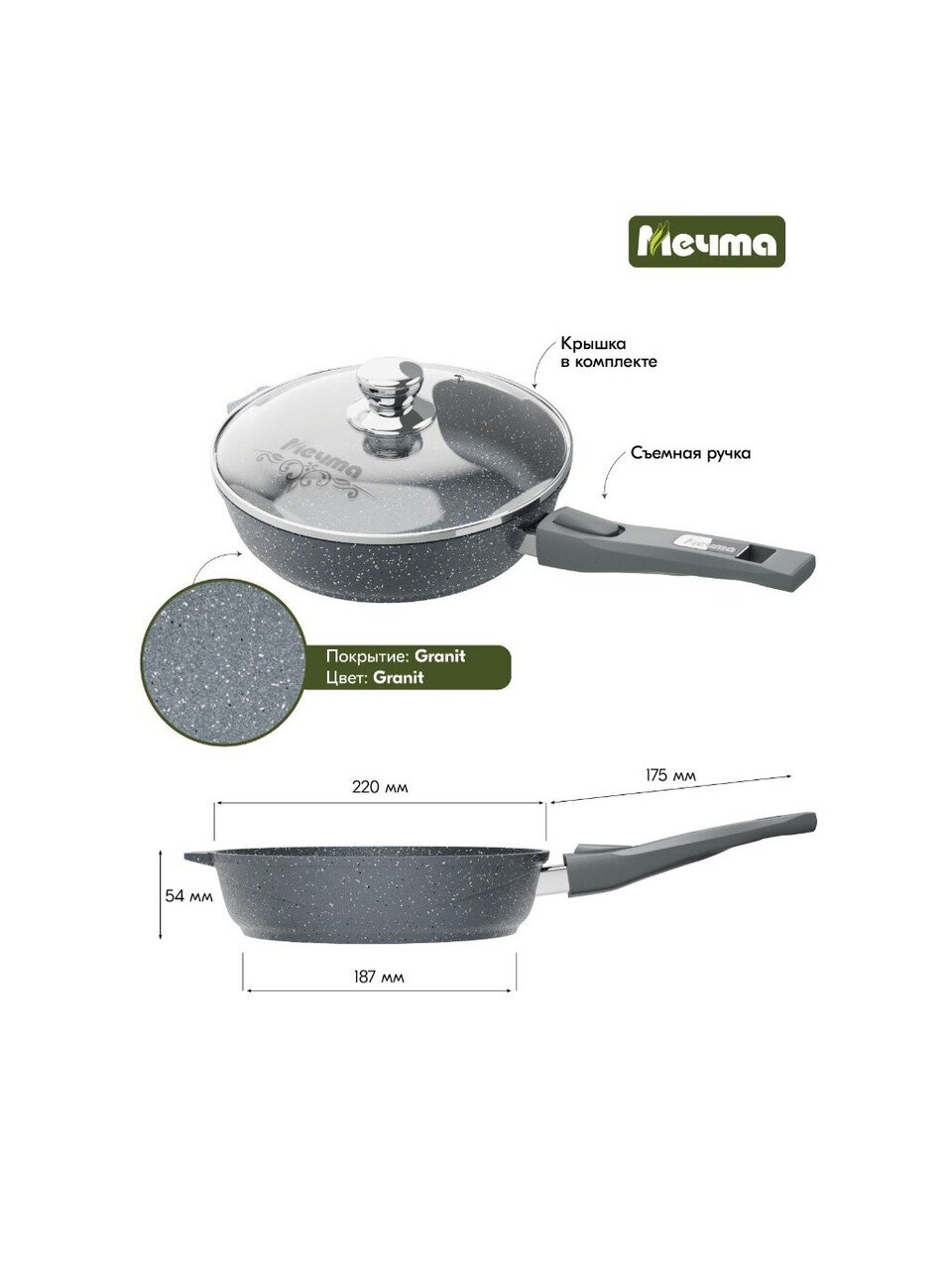 В отличие от обычных тонкостенных сковород, литой алюминий не деформируется со временем и устойчив к сколам. Съемная ручка и крышка позволяют использовать сковороду в духовке и экономить место на кухне. Если вы ищете, какую сковороду купить недорого для дачи или подарка, обратите внимание на модель «Мечта Гранит black»: она не подходит для индукции, зато совместима с газовыми, электрическими, стеклокерамическими и галогеновыми плитами. Подходит для жарки, тушения, запекания, приготовления омлетов и оладий.