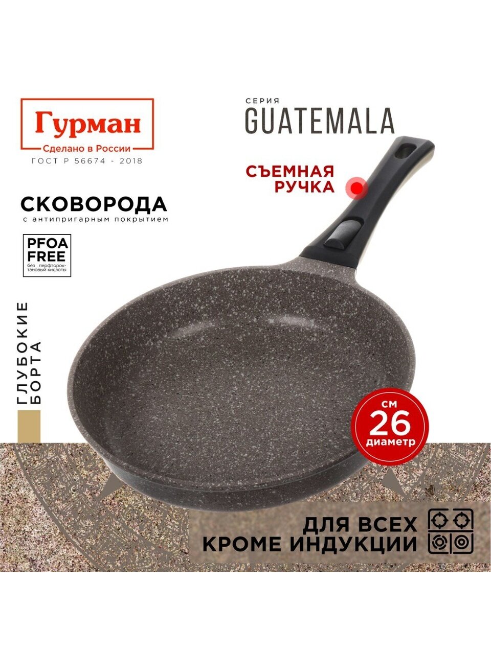Сковорода 26 см Гурман Guatemala: литой алюминий, мраморное антипригарное покрытие, съемная ручка — идеальный выбор для семьи и дачи.