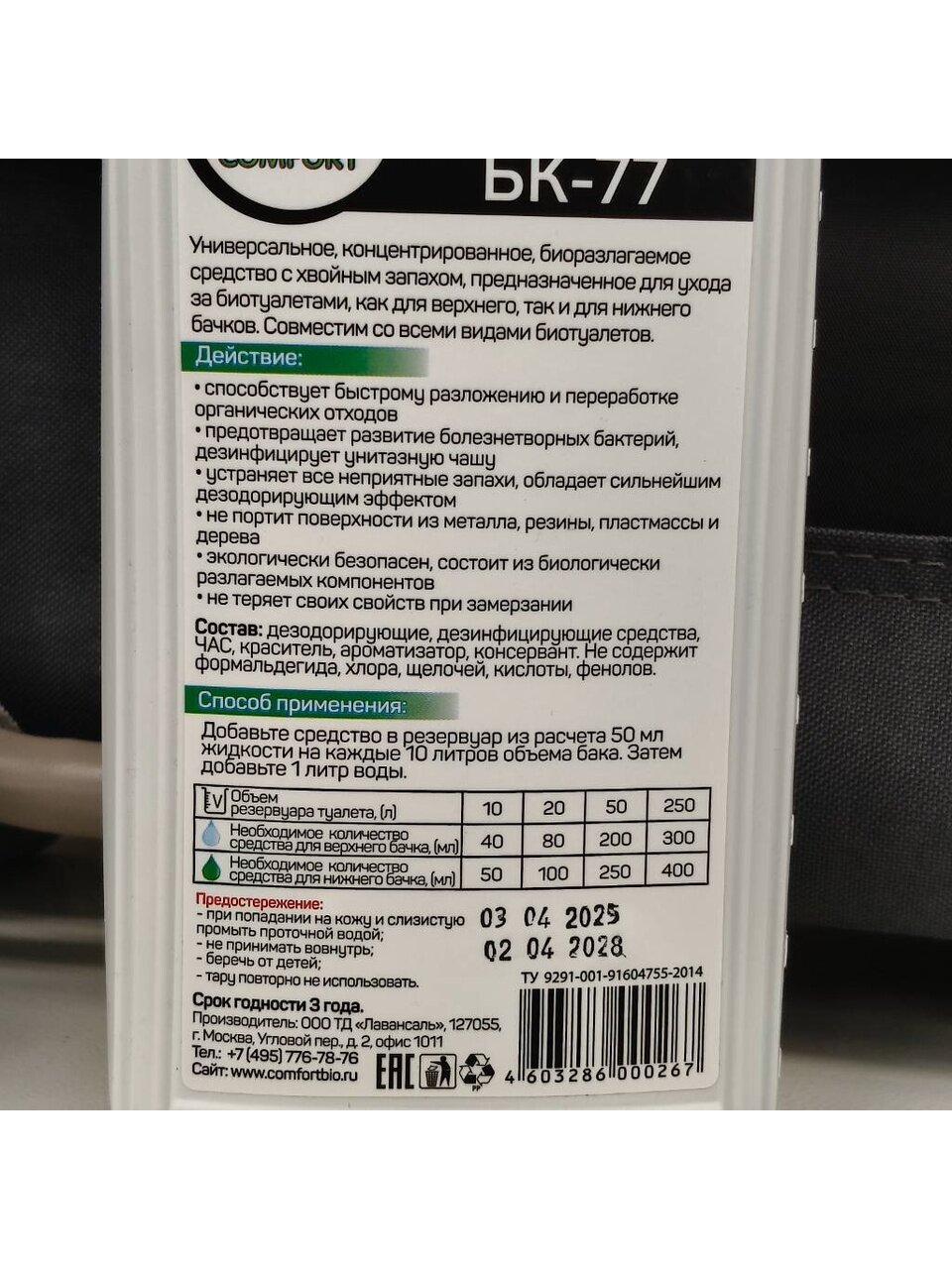 Средство Биокомфорт БК-77 универсальное, концентрированное, биоразлагаемое средство с хвойным запахом, предназначенное для ухода за биотуалетами, как для верхнего, так и для нижнего бачков. Совместим со всеми видами биотуалетов.