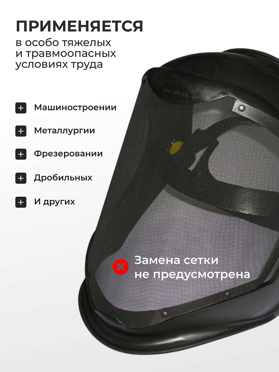 Применяется для особо тяжелых и травмоопасных условий труда в машиностроении, металлургии, нефте и газодобывающей , перерабатывающей, строительной и других отраслях народно-хозяйственного комплекса для защиты глаз, лица и лобной части головы при работе на станках, производственных установках и оборудовании, при скоростном точении, фрезеровании, дробильных, камнетесных и других работах.