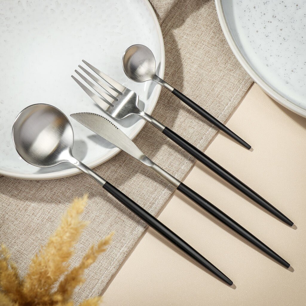 Набор столовых приборов из нержавеющей стали на 6 персон: стильный подарок в черной гамме, долговечность и универсальность для любого случая.