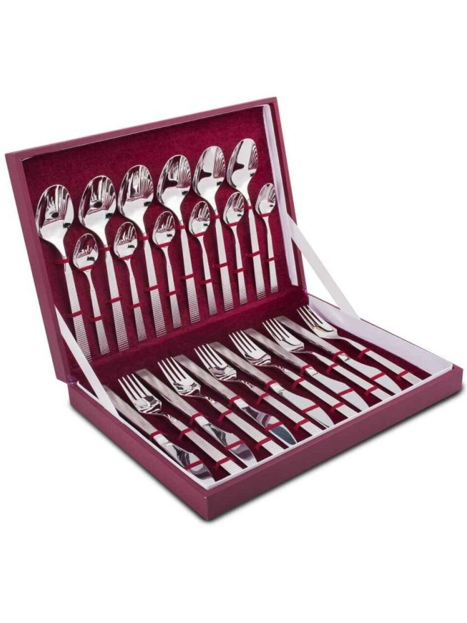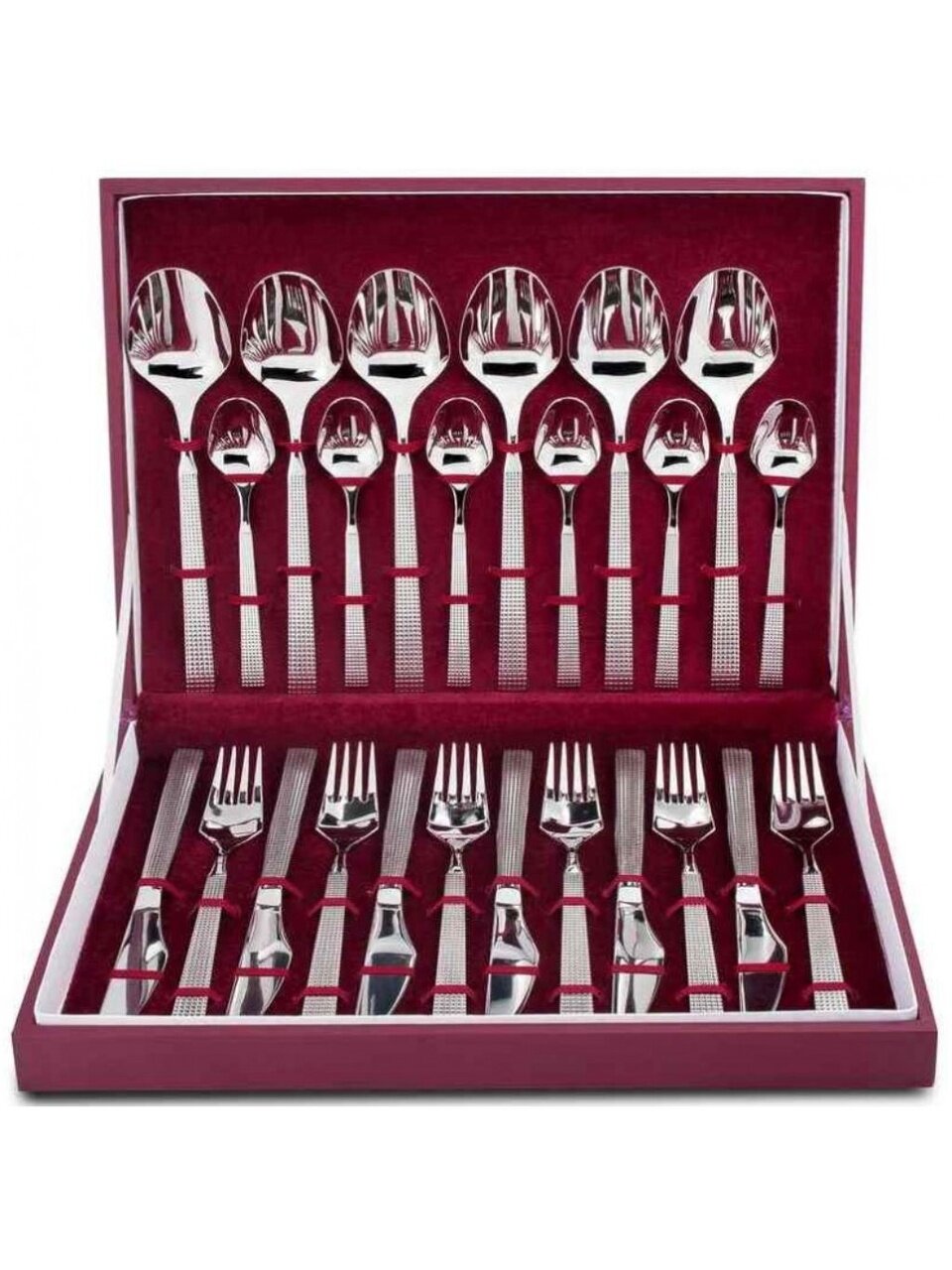 В комплекте 24 предмета: ложки, вилки, ножи и чайные ложки для 6 персон. Подходит для дома, дачи, офиса, праздничных застолий и в качестве подарка.