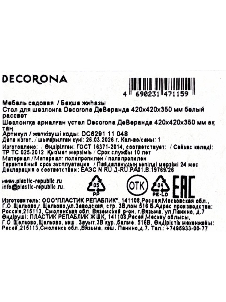 Стол для шезлонга Decorona DeVeranda — это практичный аксессуар для загородного участка, балкона или террасы. Благодаря компактным размерам 42х42х35 см и максимальной нагрузке до 30 кг, столик подходит для размещения напитков, закусок, книг или техники на природе. Белый цвет гармонирует с любым интерьером, а прочный пластик не боится дождя и солнца. Если вы ищете, какой стол выбрать для дачи или отдыха, обратите внимание на простоту ухода и долговечность модели — материал не выцветает и легко моется.
