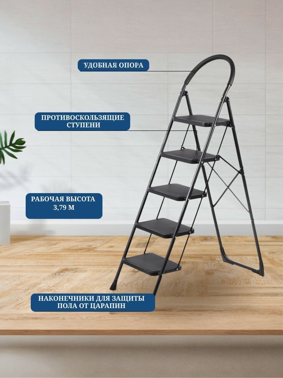 Стремянка изготовлена из высококачественных материалов, что обеспечивает ее долговечность и устойчивость.