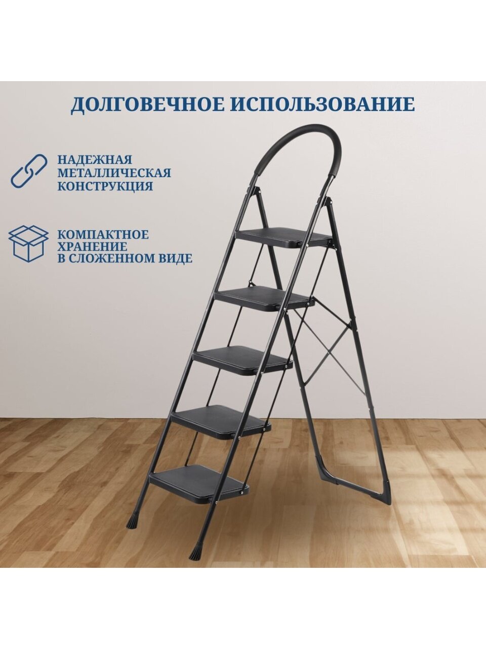 В сложенном виде стремянка занимает мало места. Это делает ее удобной для хранения как в домашних условиях, так и в профессиональной среде, где пространство также может быть ограничено.