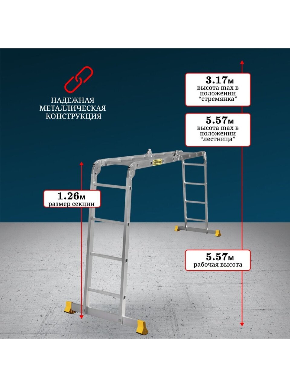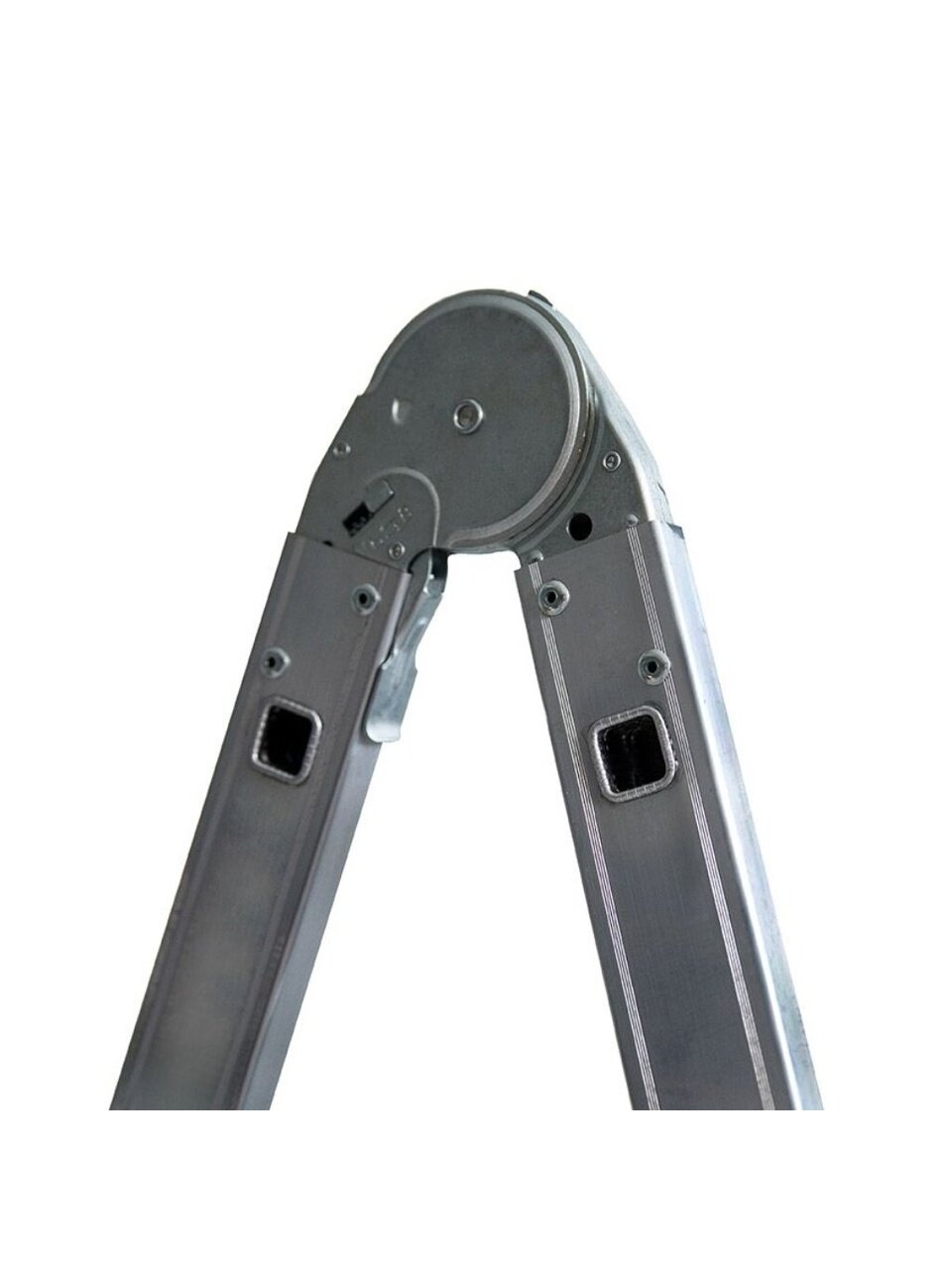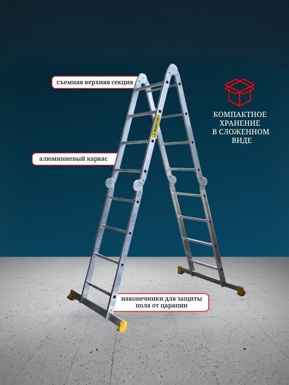 Лестница-трансформер — это шарнирная лестница состоящая из отдельных секций, соединенных между собой шарнирными замками. Каждый шарнир позволяет фиксировать различный угол между секциями. Это позволяет использовать лестницу-трансформер во многих модификациях: приставная лестница, стремянка, помост, консольная лестница и многое другое. Шарнирная лестница может складываться в 4 раза, что придает ей очень компактные размеры. При одинаковой длине в приставном виде шарнирная лестница в сложенном виде будет всегда намного компактней, чем трехсекционная универсальная лестница. Даже самая большая лестница-трансформер влезает в багажник легкового автомобиля.