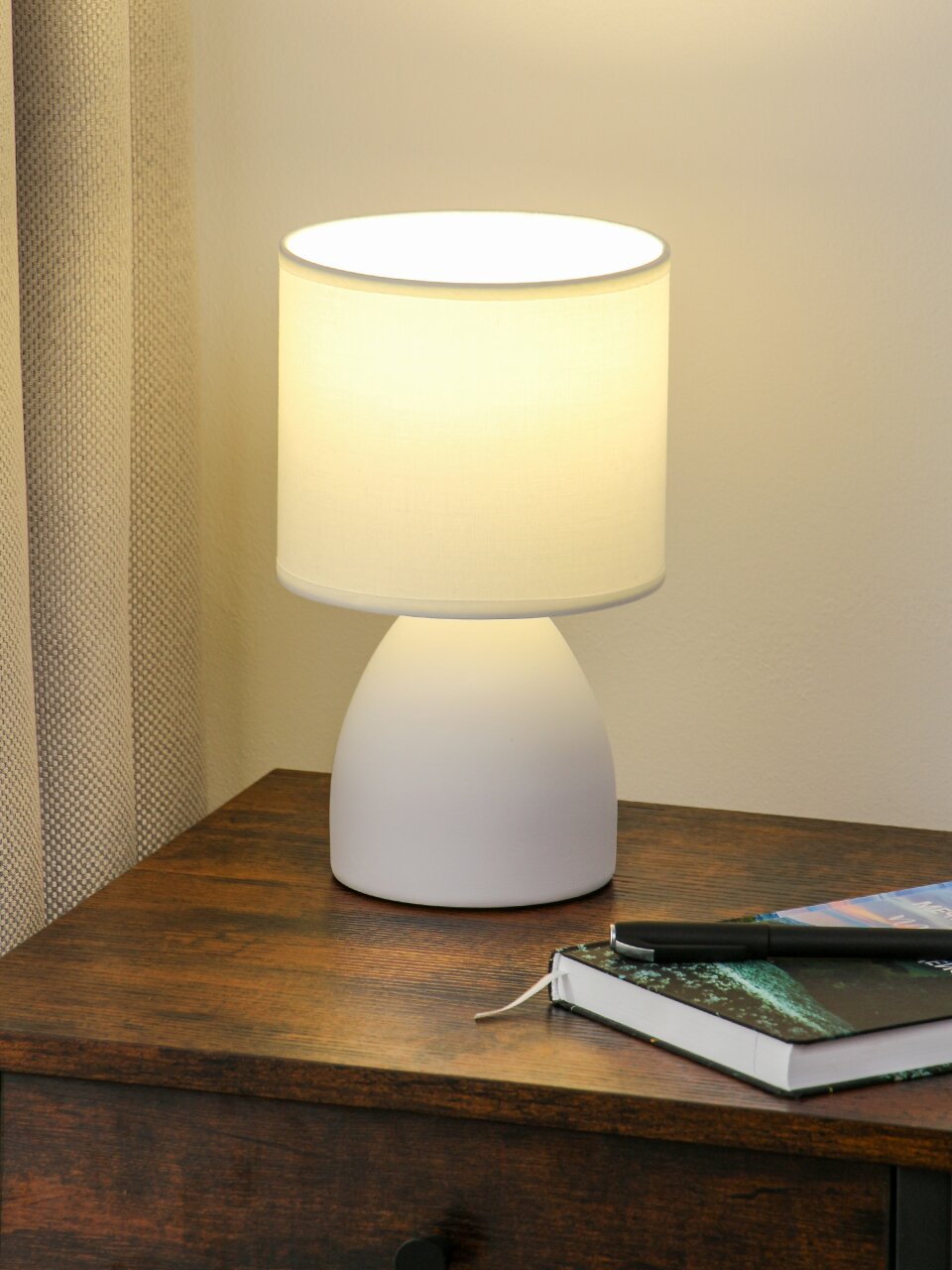Настольный светильник с цоколем E14 и мощностью до 40 Вт — это оптимальный выбор для создания мягкого, нейтрального освещения. Белый абажур из текстиля рассеивает свет, делая атмосферу уютной и не утомляющей для глаз. Керамическая арматура обеспечивает устойчивость и долговечность, а современный стиль легко сочетается с минималистичными и классическими интерьерами.