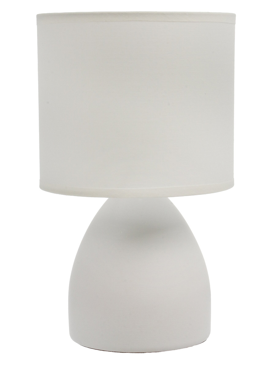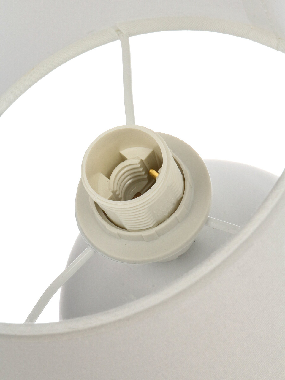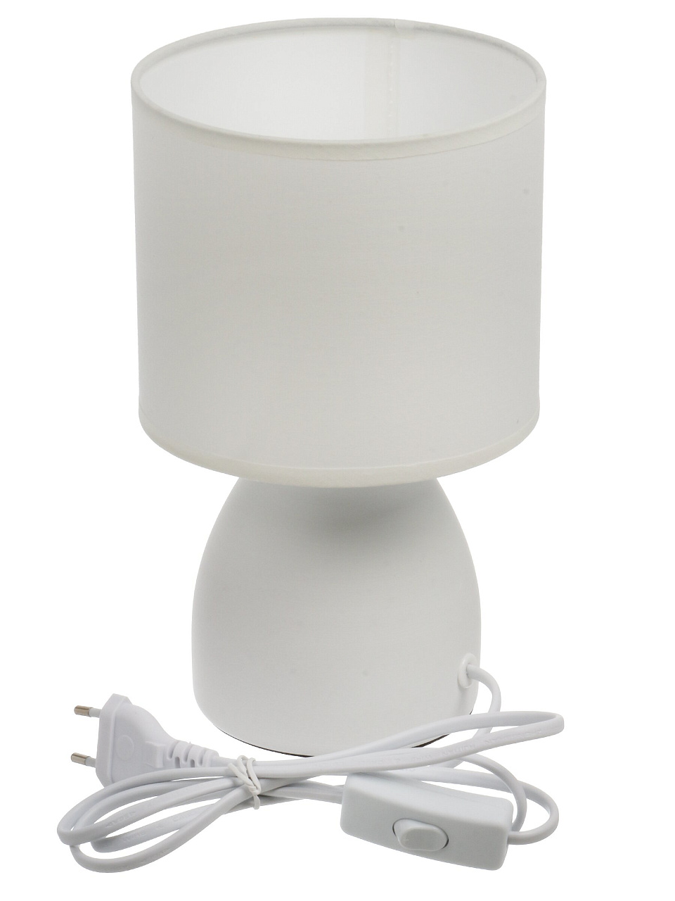 Высота — 25 см, арматура выполнена из керамики, абажур — из текстиля. Цвет — полностью белый, стиль — современный, питание — от сети 220 В.
