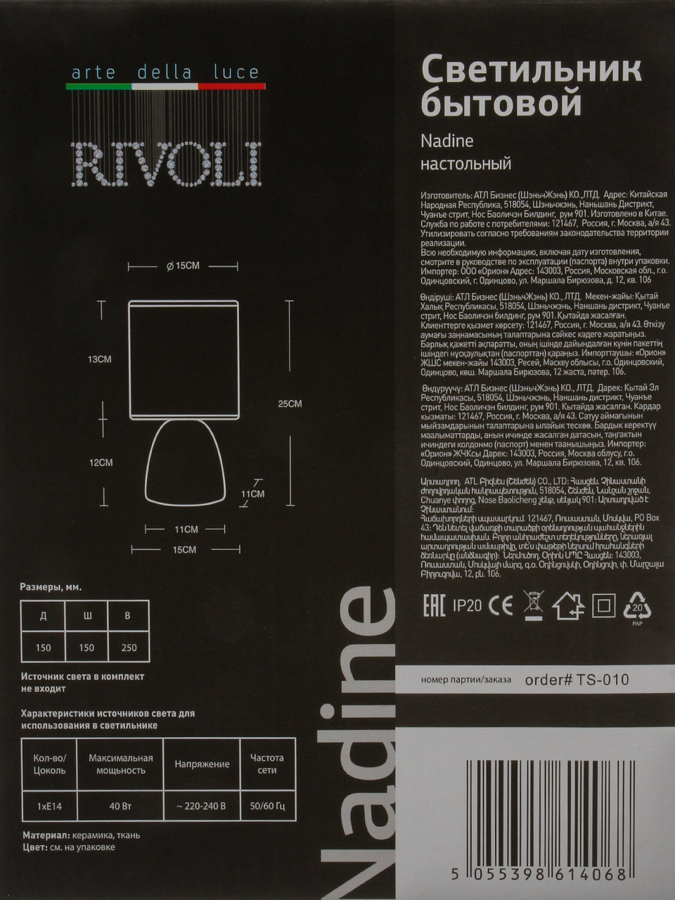 Если вы ищете, какой светильник выбрать для подарка или как купить недорого настольную лампу для дачи — модель Rivoli Nadine с гарантией 12 месяцев станет выгодным и стильным решением. Закажите прямо сейчас и получите светильник с проверенным качеством и быстрой доставкой.