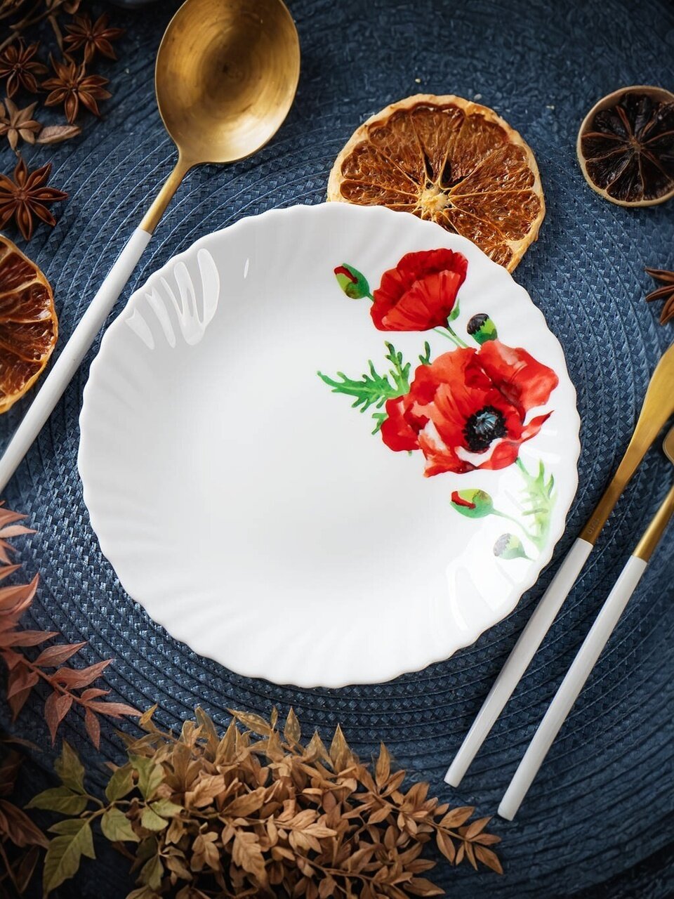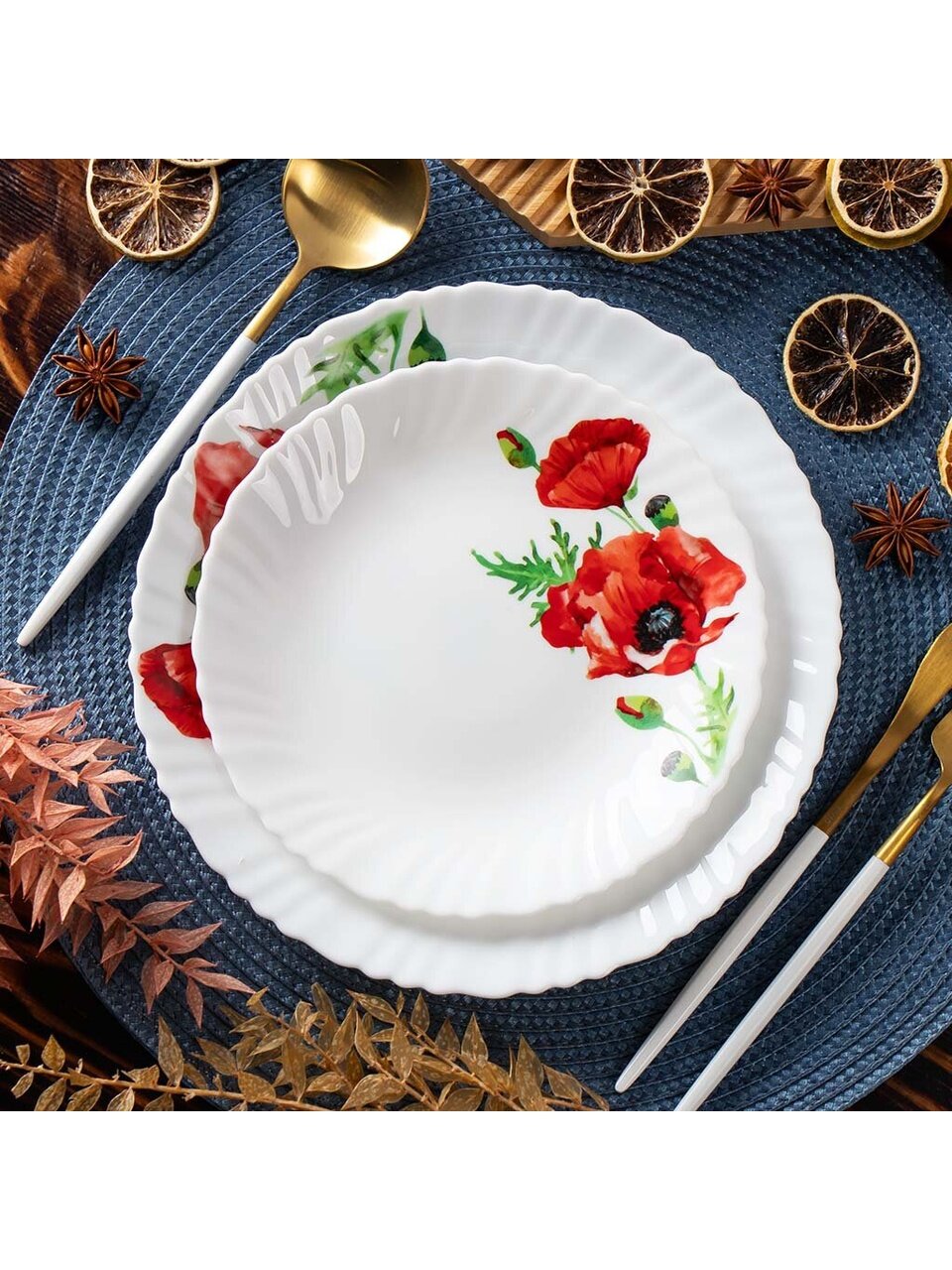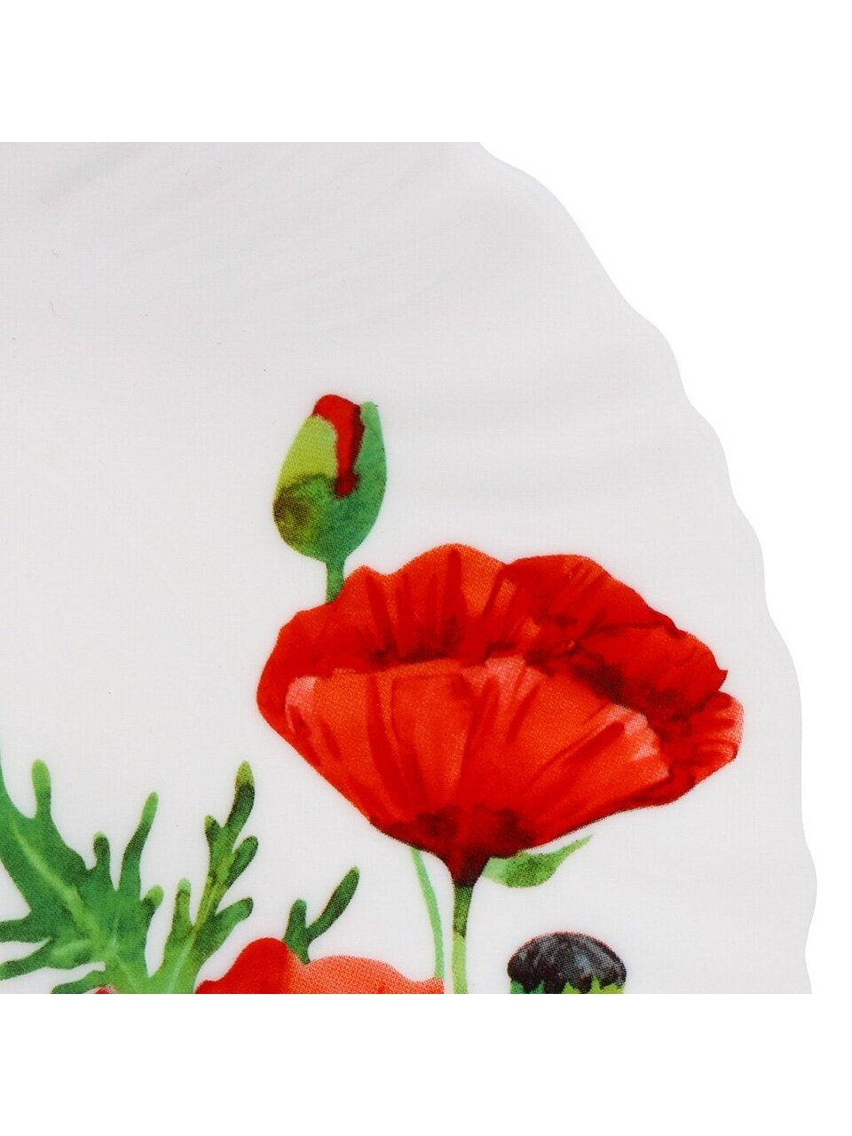 - Яркий рисунок «Алый мак» — выделяется на столе, добавляет атмосферу праздника
