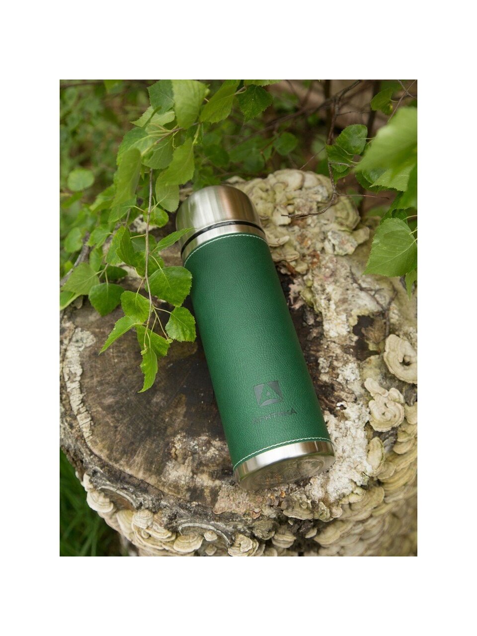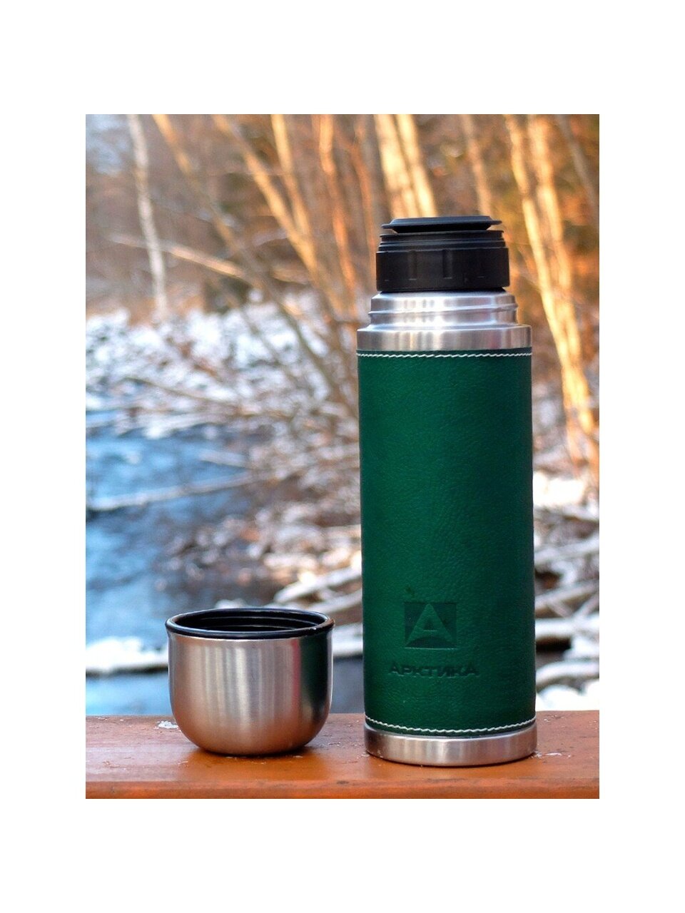 Термос Арктика 1 л с узкой горловиной и кожаной оплеткой: сохраняет тепло до 28 часов, стильный зеленый корпус — идеален для города и похода.
