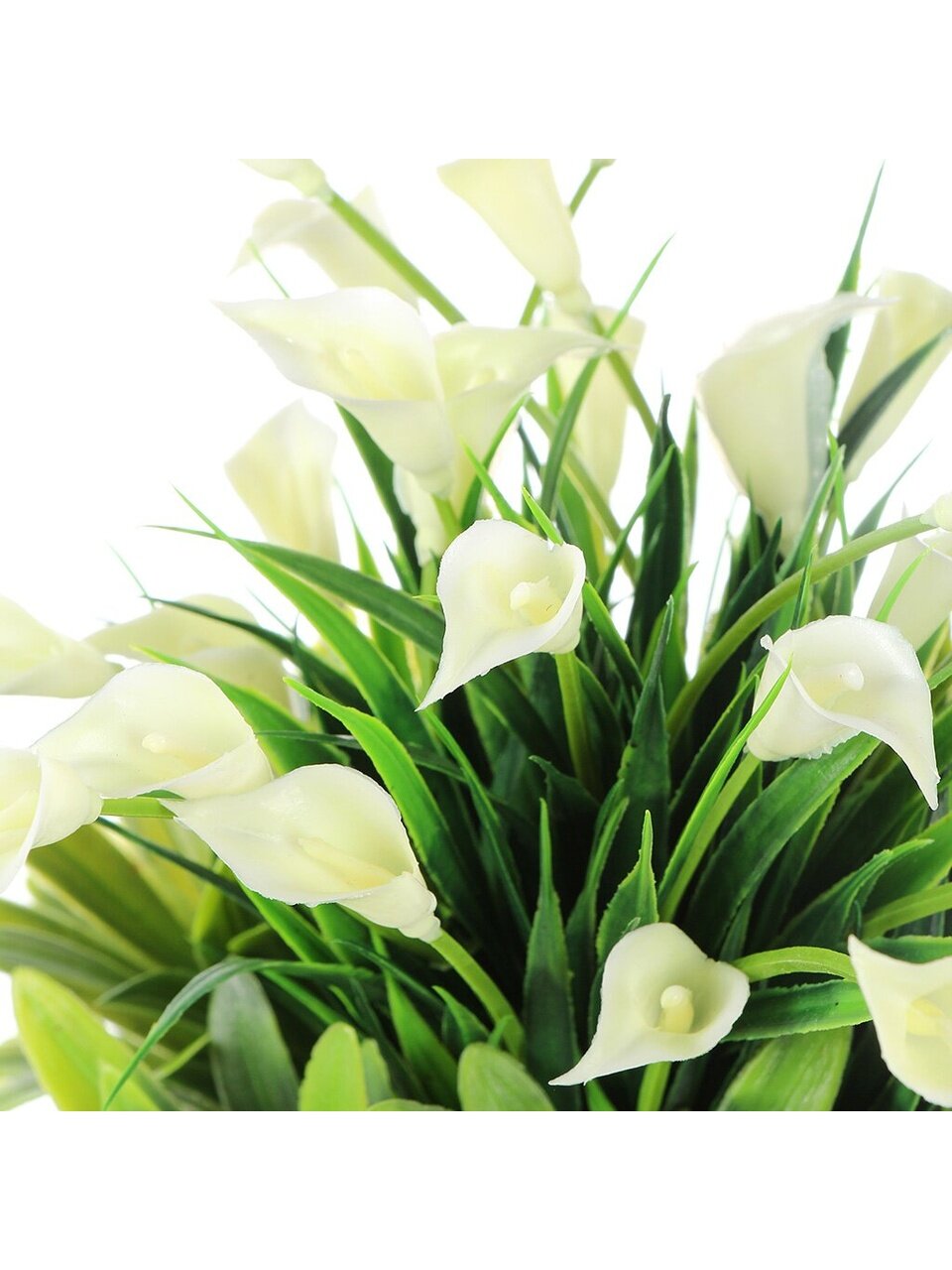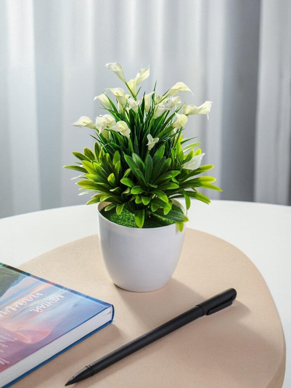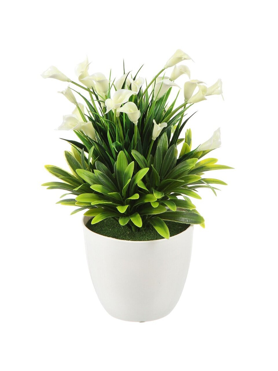 Искусственный цветок каллы в белом кашпо 24х9 см: стильный декор для дома и офиса, всегда свежий вид без ухода и аллергии.
