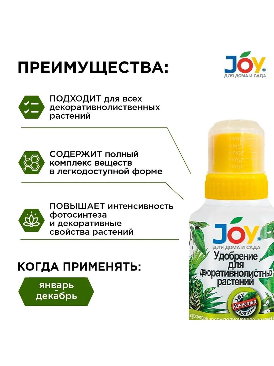 Удобрение Joy подойдет абсолютно для всех декоративных растений, обеспечит оптимальные условия для здорового роста и развития.